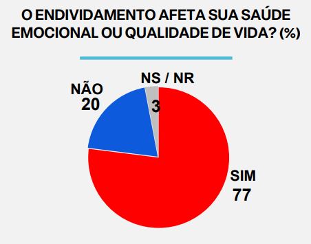 Além disso, 51% dos endividados acreditam que ao final de 2025 eles estarão “mais endividados” ou “do mesmo jeito”. Infelizmente, na matemática do endividamento não há segredo: o tempo e os juros compostos jogam contra os devedores. Um segundo ponto importante que ao meu ver merece destaque na pesquisa é que ela evidencia uma outra faceta importante do endividamento que vai muito além do dinheiro: o endividamento afeta a saúde emocional e qualidade de vida das pessoas.
