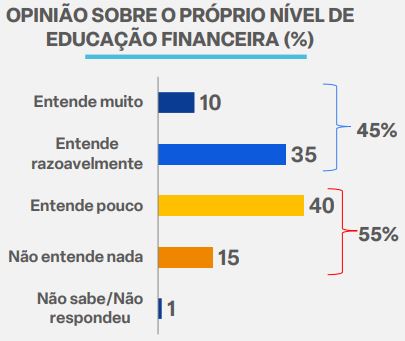 Um primeiro ponto que considero importante destacar dentre os resultados apresentados na pesquisa trata-se da opinião dos brasileiros em relação ao próprio nível de educação financeira: 55% dos entrevistados afirmaram que “entende pouco” ou “não entende nada” de educação financeira.